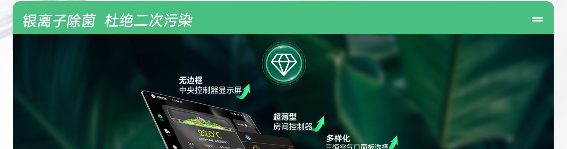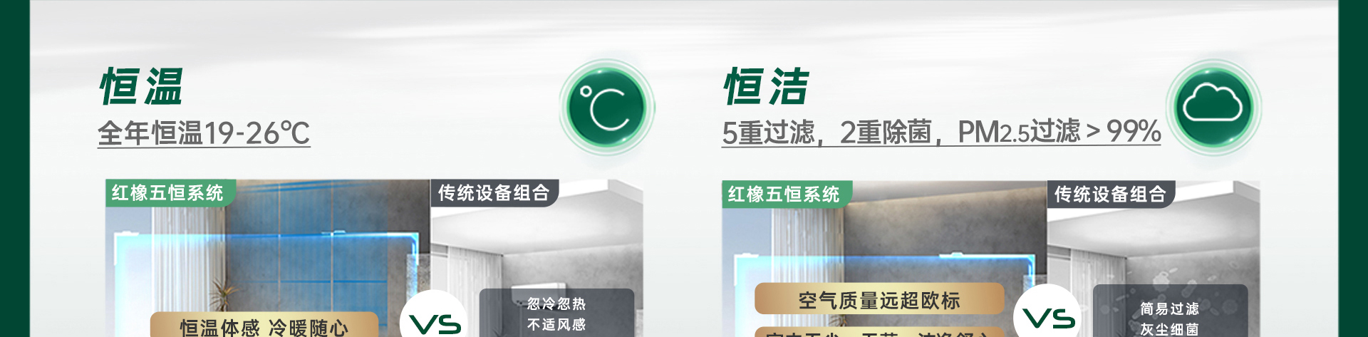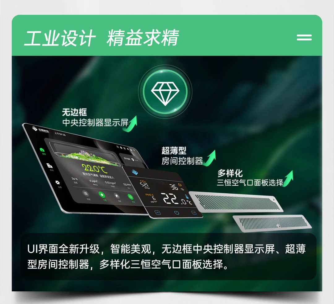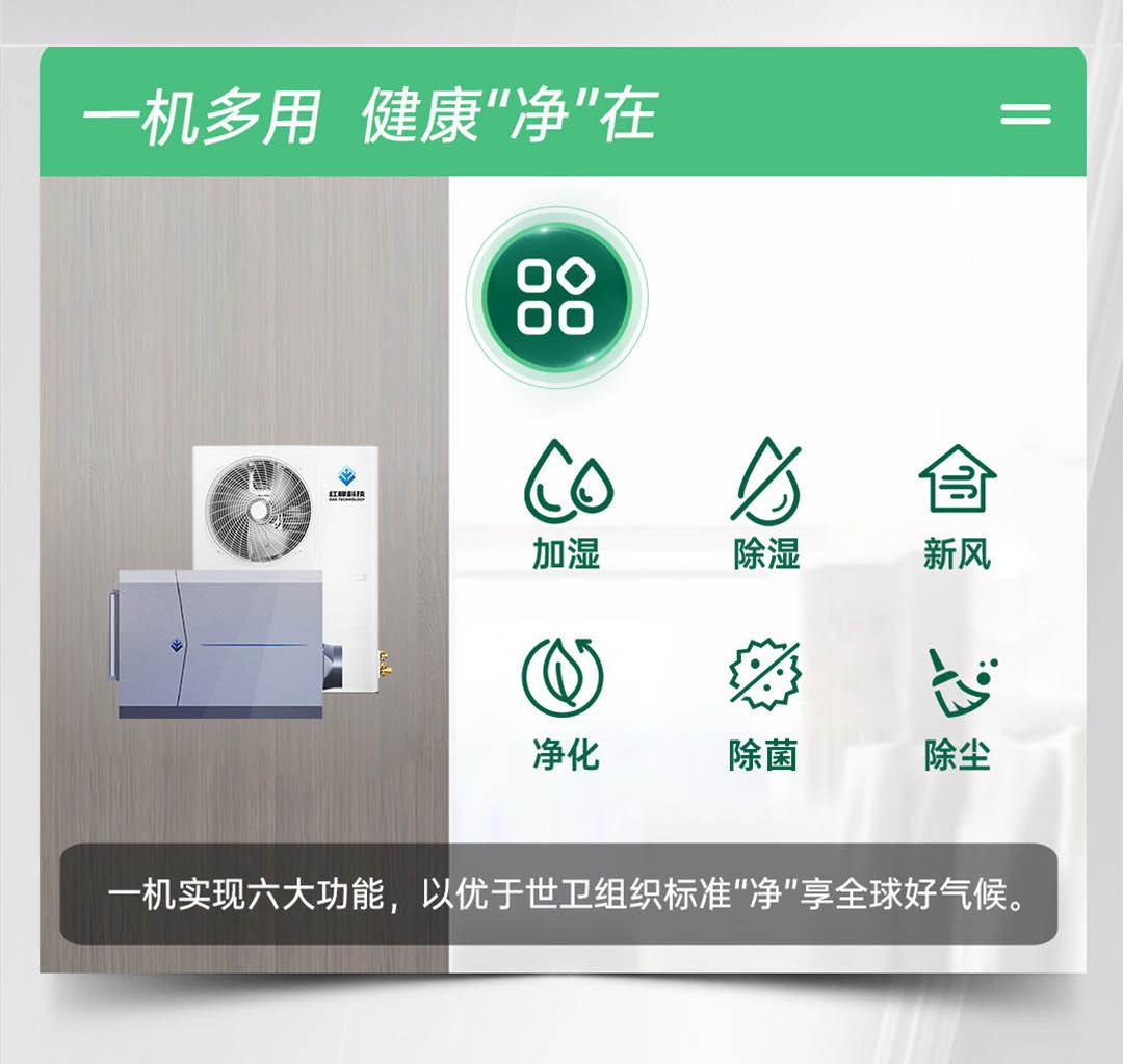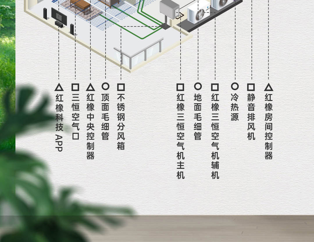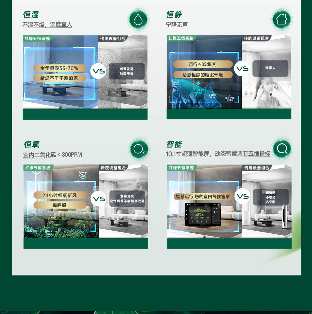 尊享版紅橡五恒系統(tǒng),以科技的手段建立四季如春的優(yōu)越室內(nèi)氣候環(huán)境,一套系統(tǒng)迭代空調(diào)、地暖、新風(fēng)、除濕機(jī)、加濕機(jī)、空氣凈化機(jī)和空氣消毒機(jī)的設(shè)備組合,滿足客戶對室內(nèi)溫度、濕度、含氧量、潔凈度、環(huán)境噪聲等多方面、多維度 的需求。