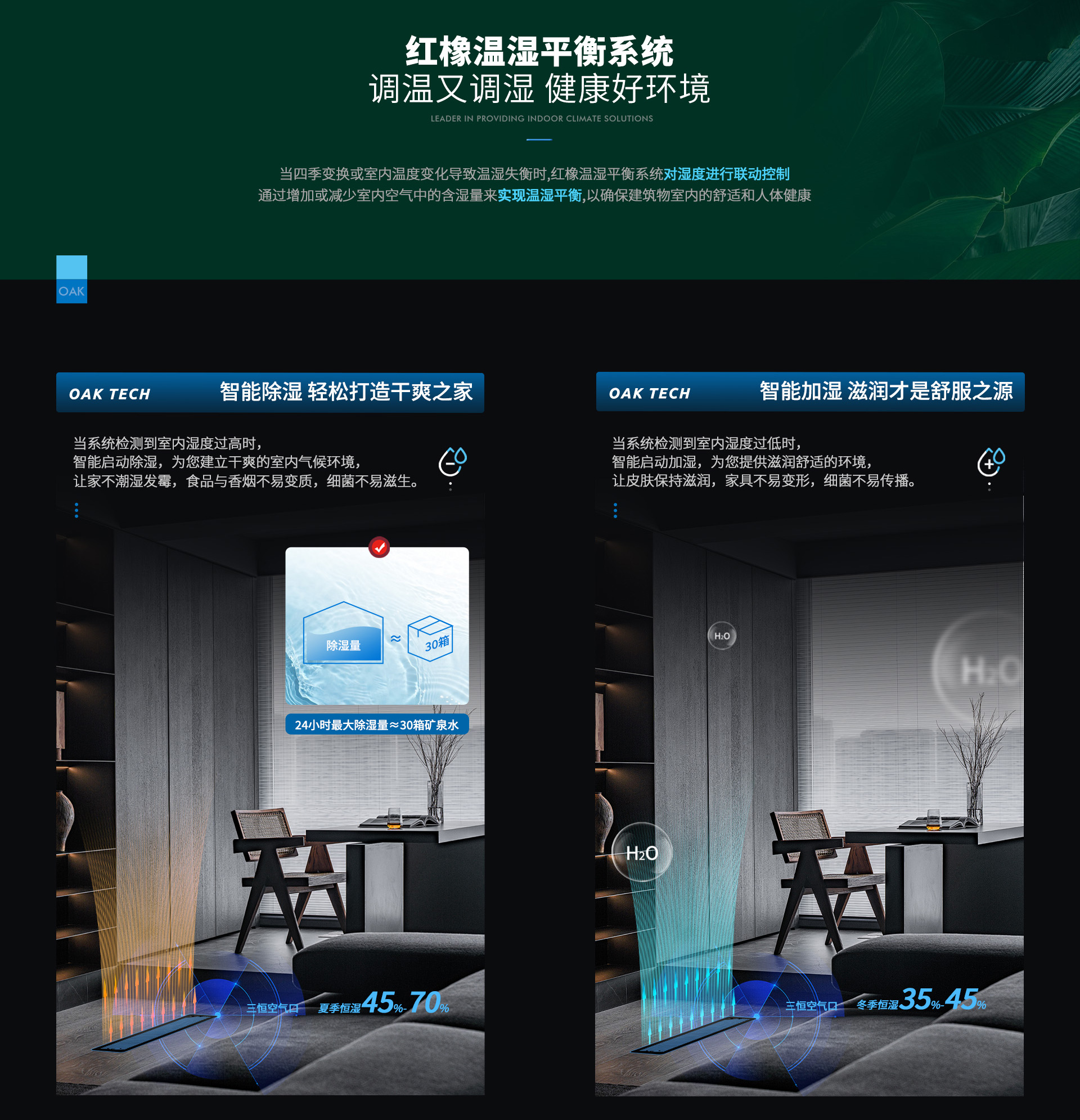 四季的變換或室內(nèi)溫度的高低,會(huì)導(dǎo)致室內(nèi)空氣濕度的劇烈變化,從而對(duì)人體健康構(gòu)成不利影響,紅橡溫濕平衡與潔凈空氣系統(tǒng)(簡稱“溫濕平衡系統(tǒng)”)就是在四季變換與室內(nèi)溫度變化導(dǎo)致溫濕失衡的同時(shí),對(duì)濕度進(jìn)行聯(lián)動(dòng)控制,當(dāng)室內(nèi)干燥或潮濕時(shí),通過增加或減少室內(nèi)空氣中的含濕量來實(shí)現(xiàn)溫濕平衡,以確保建筑物室內(nèi)的舒適和人體健康。